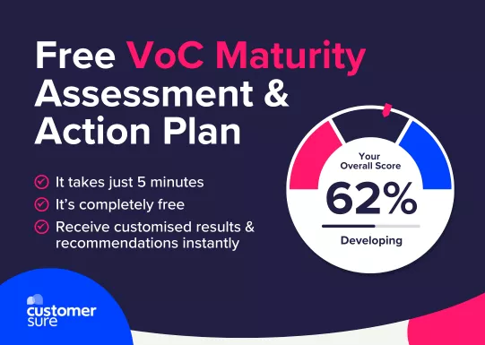 Check out our guides and resources to learn more about customer experience and Voice of the Customer, and how you can use them to measurably reduce churn and improve new sales. Better still… Ask us for help! We’ll produce you a free VoC maturity assessment. All it takes is a few minutes of us listening to your current objectives and challenges.